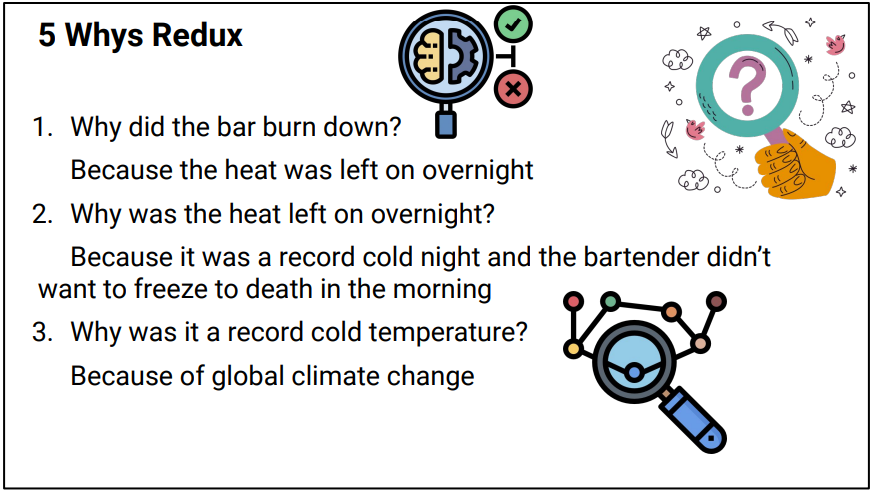 It started off talking through some made up examples, walking through the five whys, getting good conclusions and then everyone dies. Repeatedly.