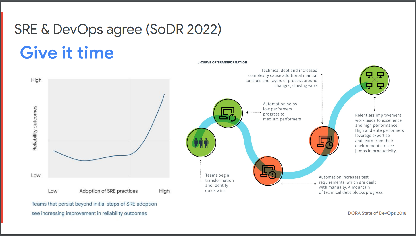 Like in other talks, the Google SRE book was picked on due to its missing premise and how when it launched, people thought this is how it was, not the aspirational goal to work towards.
