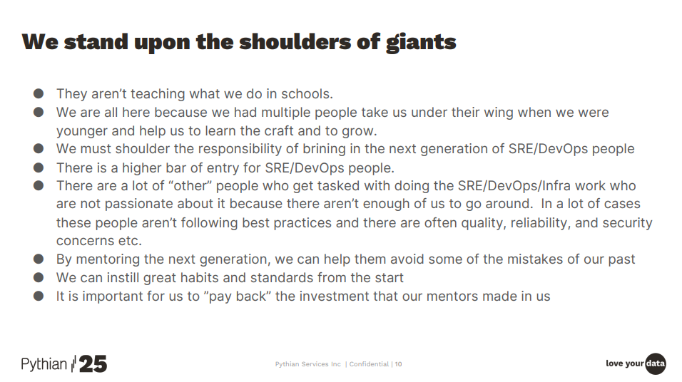 - Passing the Torch - Building a New Grad Program to Mentor the Next Generation of SRE - for anyone involved in onboarding or mentorship, especially those with junior level or interns. It covers many areas that are just assumed knowledge that people in their first jobs rarely have.