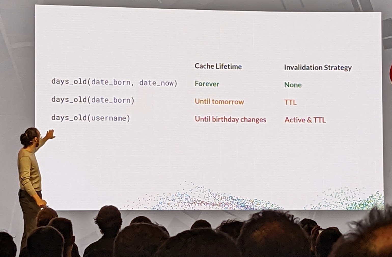 Cache invalidation is one of the harder problems in computing, the speaker suggests never invalidating the cache. They talk about splitting state out from a method to create pure functions which can be run once and cached forever. In effect defining boundaries in the system with state and without state, to allow for better caching.