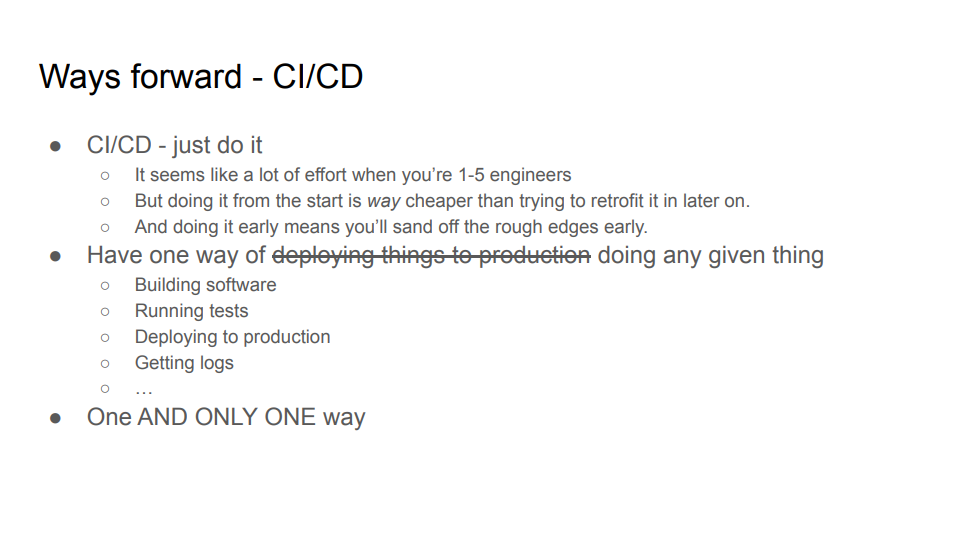 “SRE is what happens when you ask a software engineer to design an operation team”. A concept mentioned in multiple talks. Operational tasks don’t just disappear overnight and firing everyone who can’t code equals bad things happening.